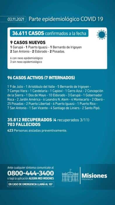 De esta manera, de acuerdo a los números oficiales dados a conocer por Salud Pública, el total de infectados por la enfermedad en la tierra colorada se eleva a 36.611, en tanto, los decesos se mantienen en 703.