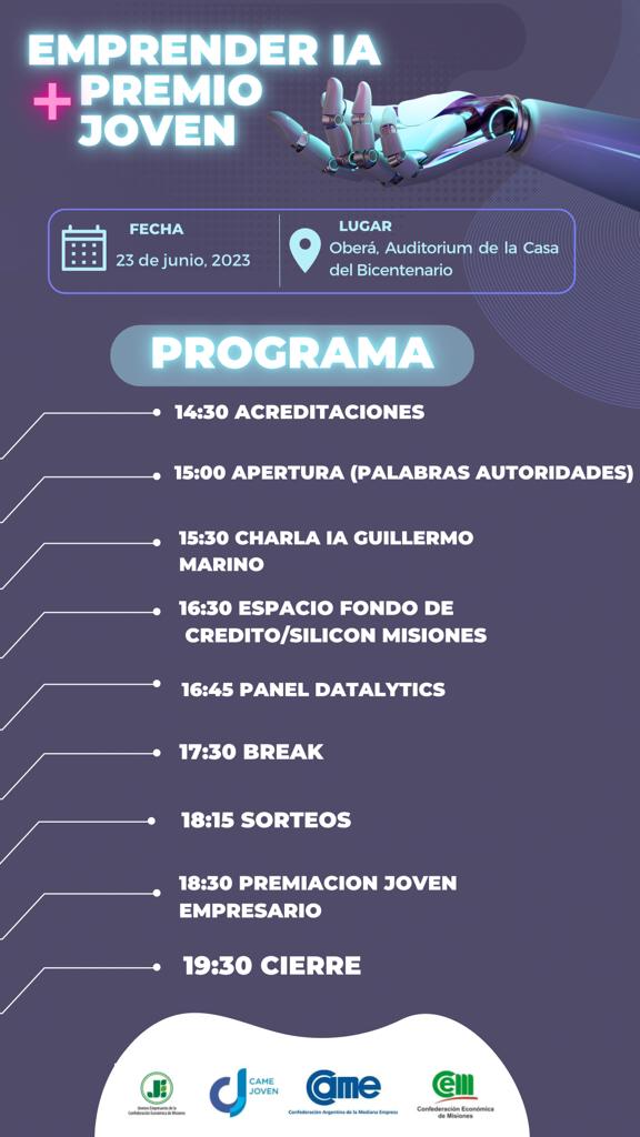 Unificamos nuestros dos eventos más grandes del año y no podes perderte! Emprender IA Misiones 2023 y Premio Joven Empresario Misionero edición 2022, organizado por la Comisión de Jóvenes de la CEM con el apoyo de la Confederación Económica de Misiones (CEM) , la Confederación Argentina de la Mediana Empresa (CAME) y CAME JOVEN.