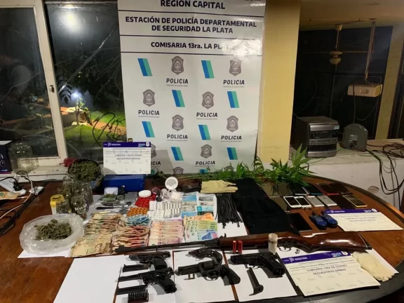 En él incautaron 12 blísteres de pastillas, una balanza digital de precisión, 500 gramos de marihuana, 366 gramos de cocaína, $5940, 12 teléfonos celulares, un rifle de aire comprimido, una réplica de Bersa Thunde 9 mm de aire comprimido y un revólver calibre 32.
