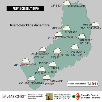 Temperaturas: máxima en la provincia estimada en 35 °C para Apóstoles con 42 °C de sensación térmica; la mínima sería de 19 °C en Bernardo de Irigoyen.
