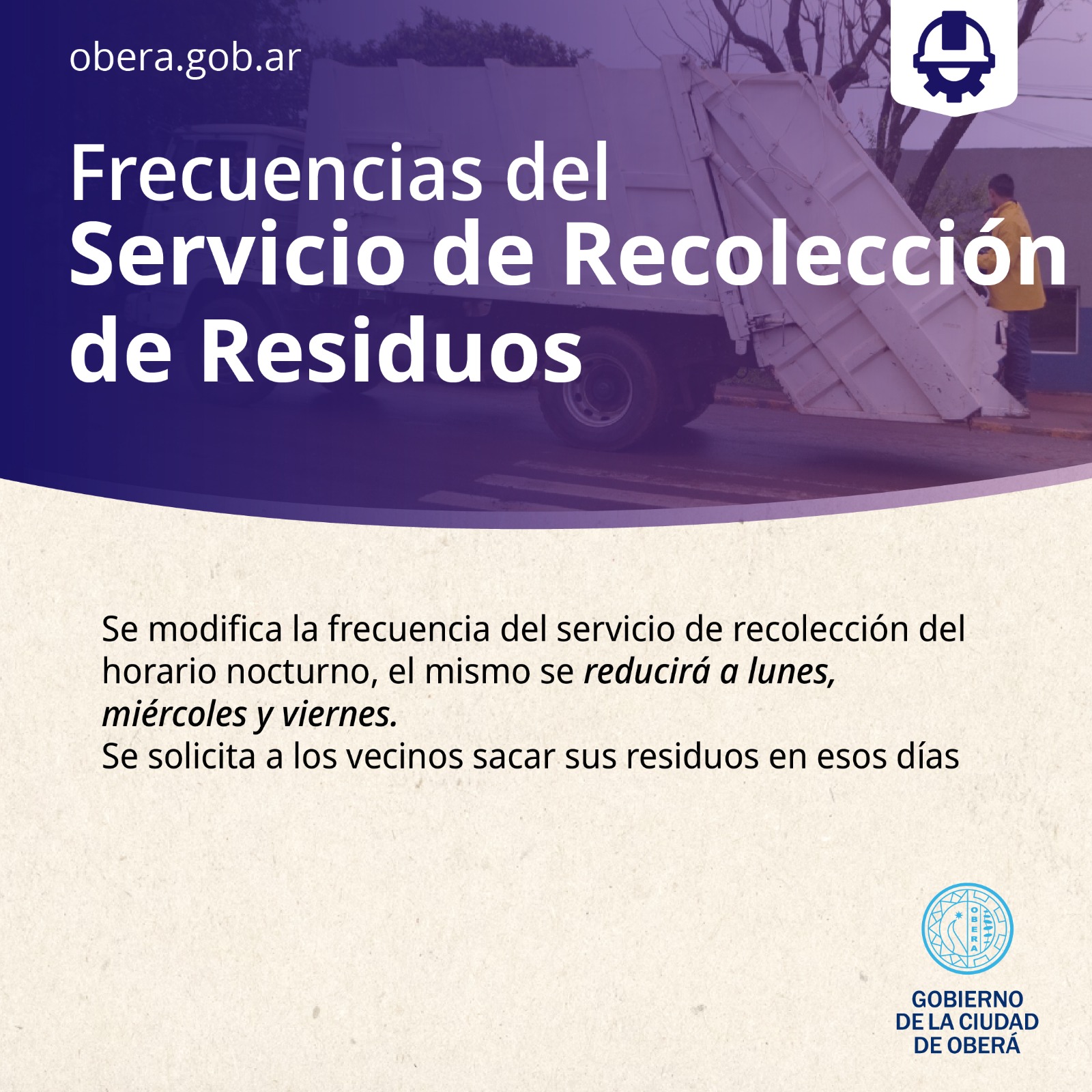 Tv En VIVO Seguinos en Google Noticias El Departamento de Servicios Públicos informa que se modifica la frecuencia del servicio de recolección del horario nocturno, el mismo se reducirá a los días lunes, miércoles y viernes. Se solicita a los vecinos sacar sus residuos en esos días. Seguinos en Google Noticias