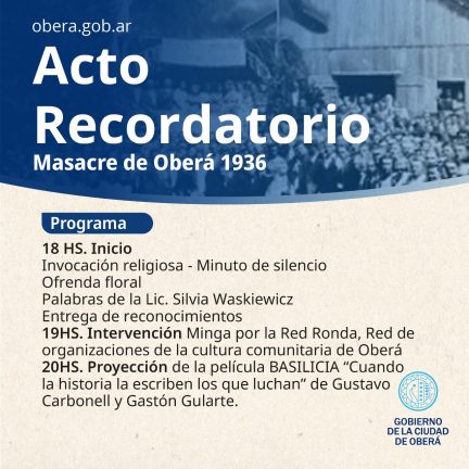 El Gobierno de la Ciudad de Oberá y la Comisión de Fiestas Cívicas y Populares invitan a todos los vecinos a participar de un acto más por la Memoria y Conciencia de lo que se denominó “Masacre de Oberá”.