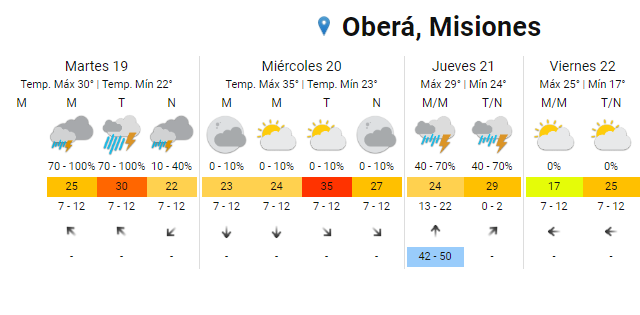 Temperaturas: máxima en la provincia estimada en 37 °C para Posadas; la mínima sería de 20 °C en Bernardo de Irigoyen.