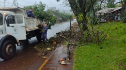 En este momento los equipos de trabajo se encuentran despejando calzadas, desgajando árboles caídos que interrumpen el tránsito para luego otro equipo las recoja.