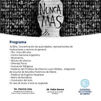 El Gobierno de la Ciudad de Oberá invita a participar del Acto por el Día Nacional de la Memoria por la Verdad y la Justicia, a realizarse el domingo 24 de marzo de 2024 a las 9 horas, en la Plazoleta de la Memoria, ubicada en Av. de las Américas, frente al barrio Mayor Krause de Oberá.