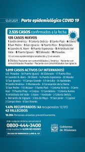 Los nuevos casos son: 76 en Posadas, doce en Eldorado, ocho en Iguazú, seis en Oberá, cinco en Aristóbulo del Valle y Puerto Esperanza y Apóstoles, cuatro en Alem y Puerto Rico, tres en San Ignacio y San Pedro, dos en Santo Pipó, uno en Colonia Delicia y Jardín América.